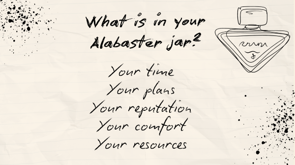 These things aren't necessarily bad in themselves, but they become hindrances when they sit on a throne in our hearts that should be reserved for Jesus alone. When we grip too tightly to our alabaster jars—the precious things we value most—we miss the opportunity to experience the joy of surrender. Mary teaches us that nothing we could possibly hold onto is worth more than what we gain when we pour it out at Jesus' feet.