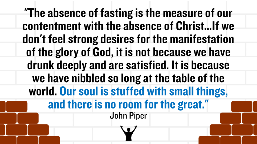John Piper offers this challenging perspective: "The absence of fasting is the measure of our contentment with the absence of Christ." He continues, "If you don't feel a strong desire for the manifestation of the glory of God, it's not because we have drunk deeply and are satisfied. It's because we have nibbled so long at the table of the world, our soul is stuck with small things with no room for the great."
