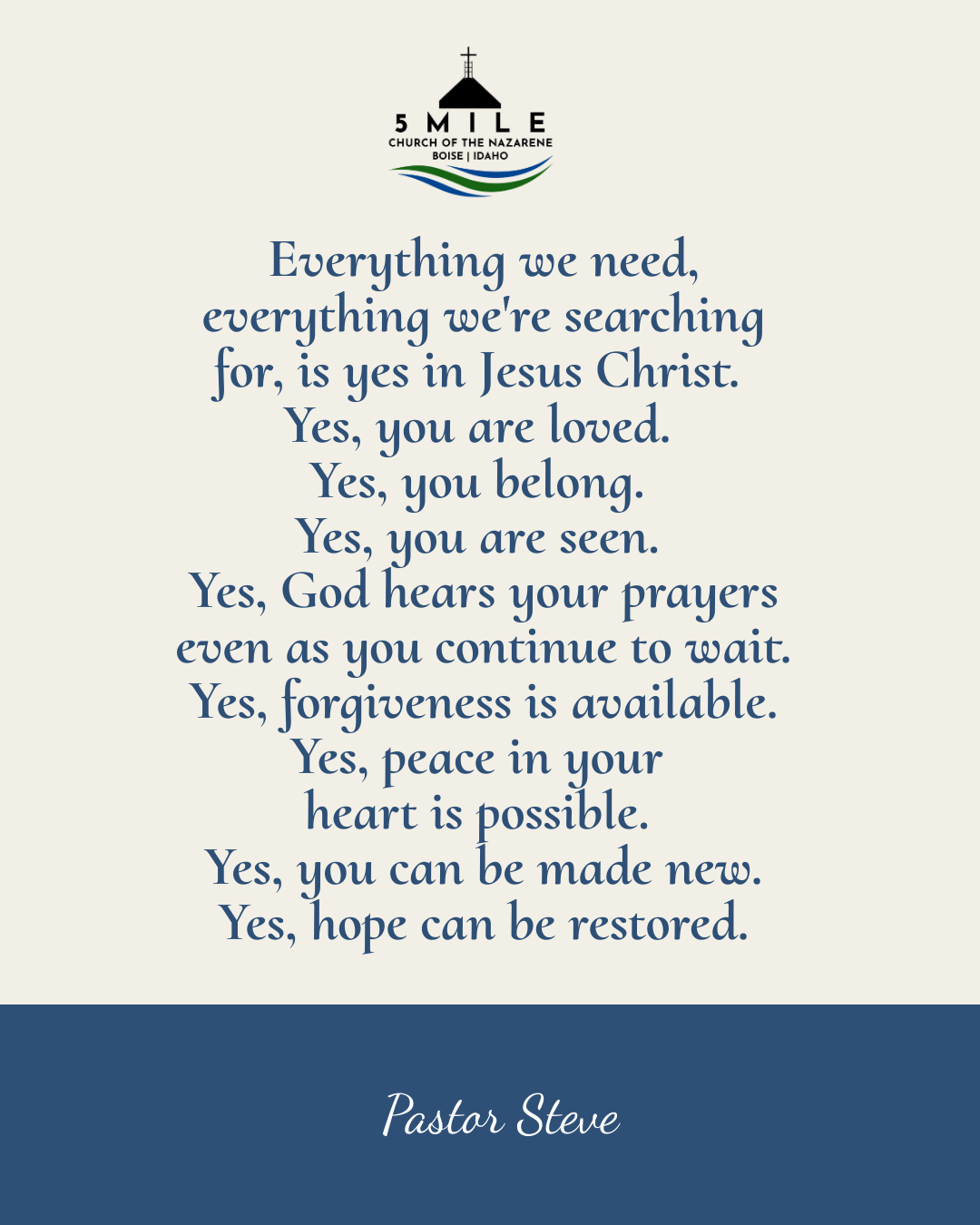 Whatever you need today—love, belonging, forgiveness, peace, hope, a fresh start—the answer is yes in Jesus.